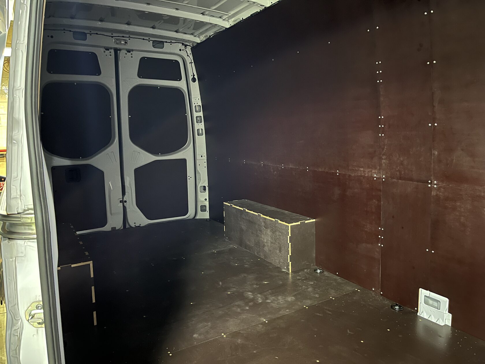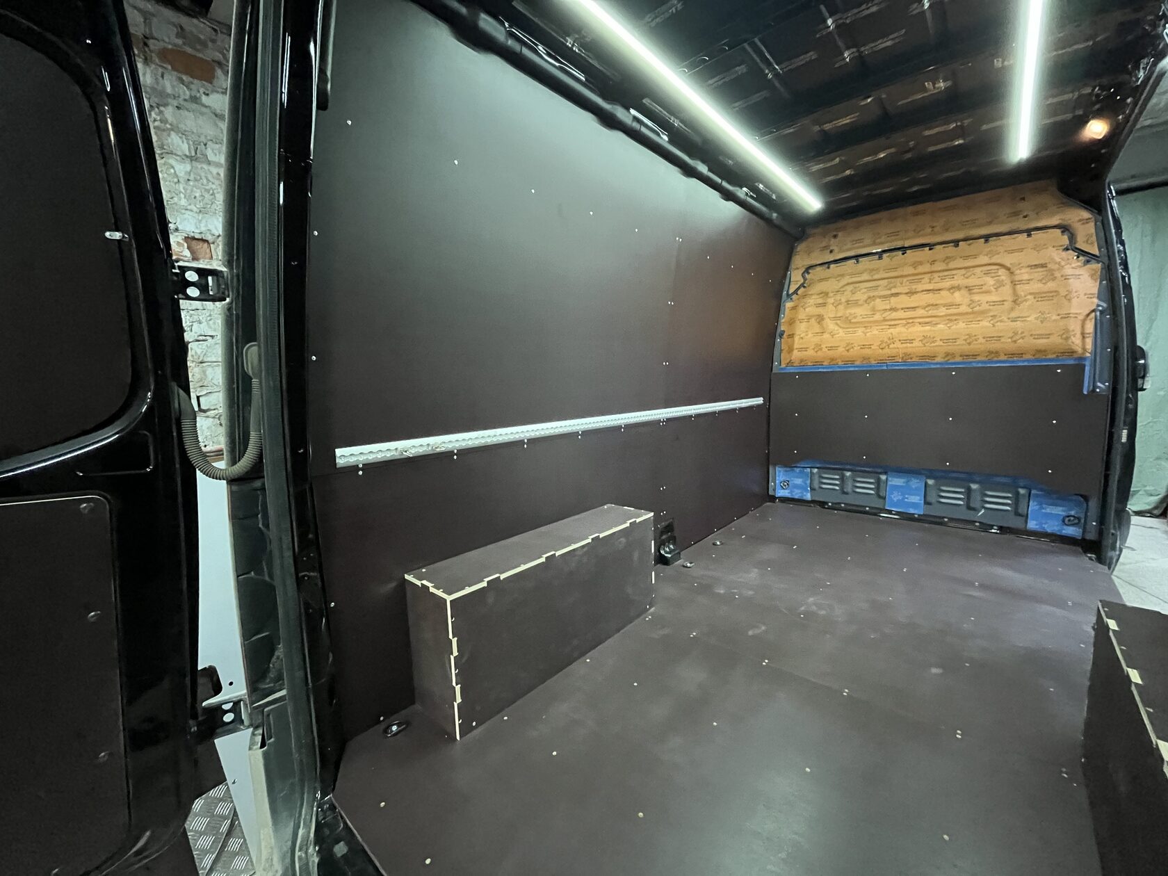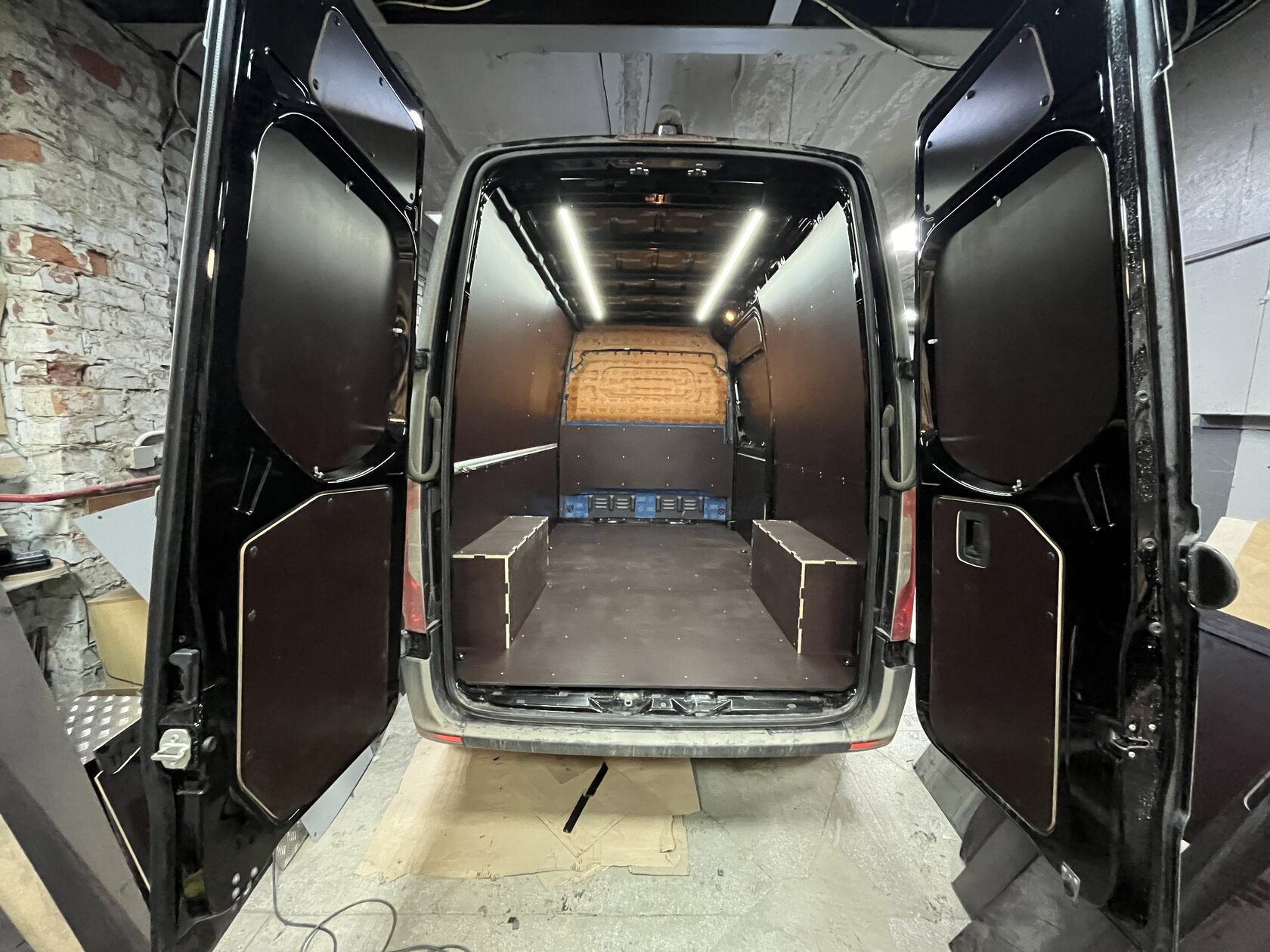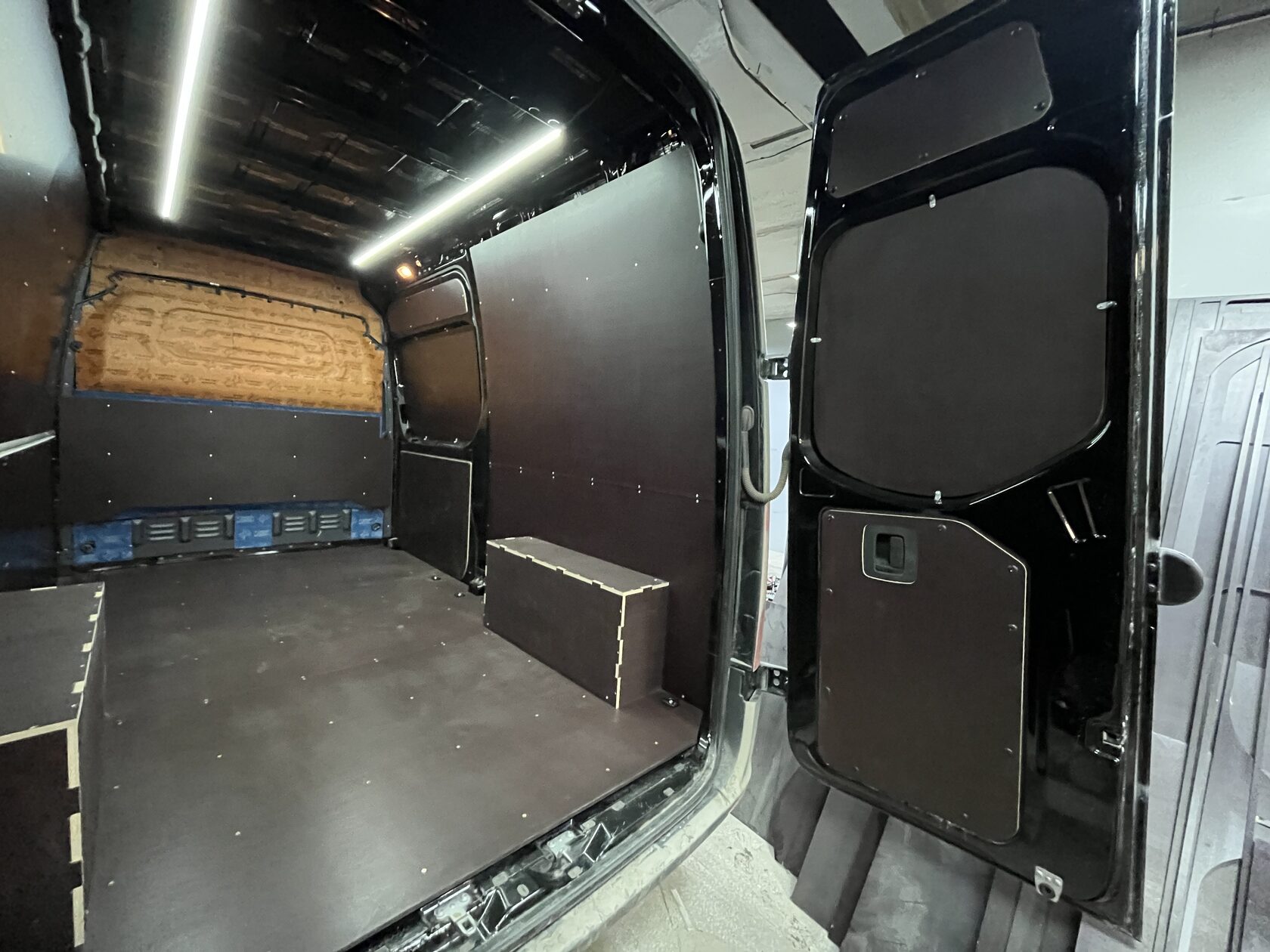 Выполнили работу по обшивке кузова Мерседес Спринтер фанерой. Полл и арки - ламинированная фанера 12мм, стены, двери, перегородка - ламинированная фанера 6мм.
