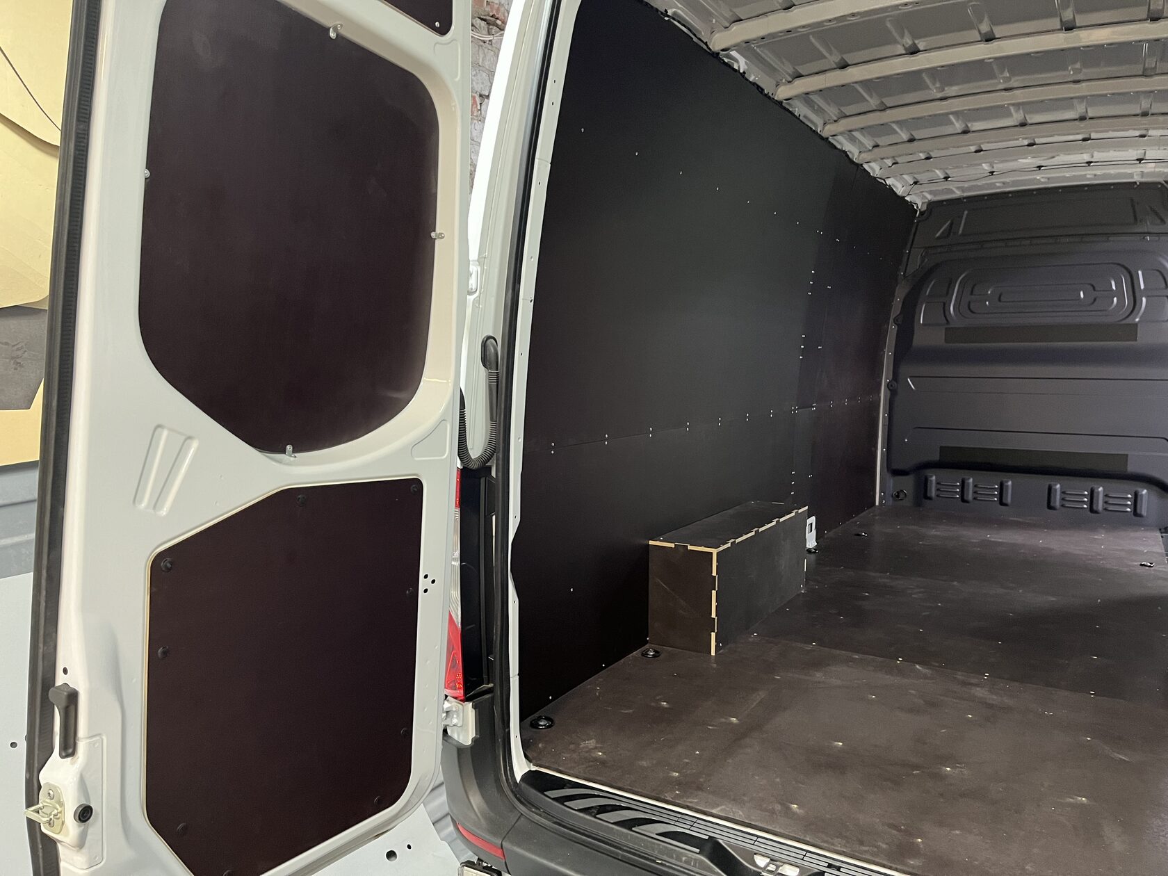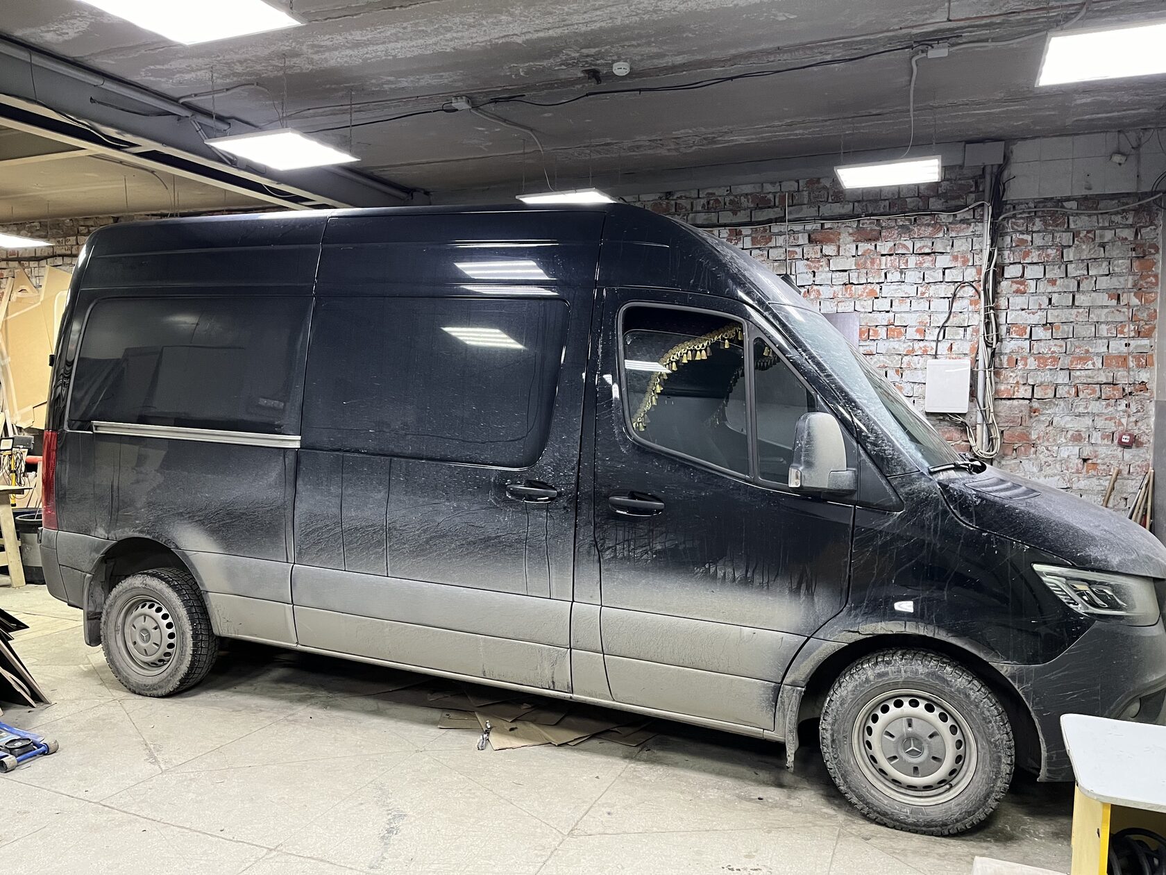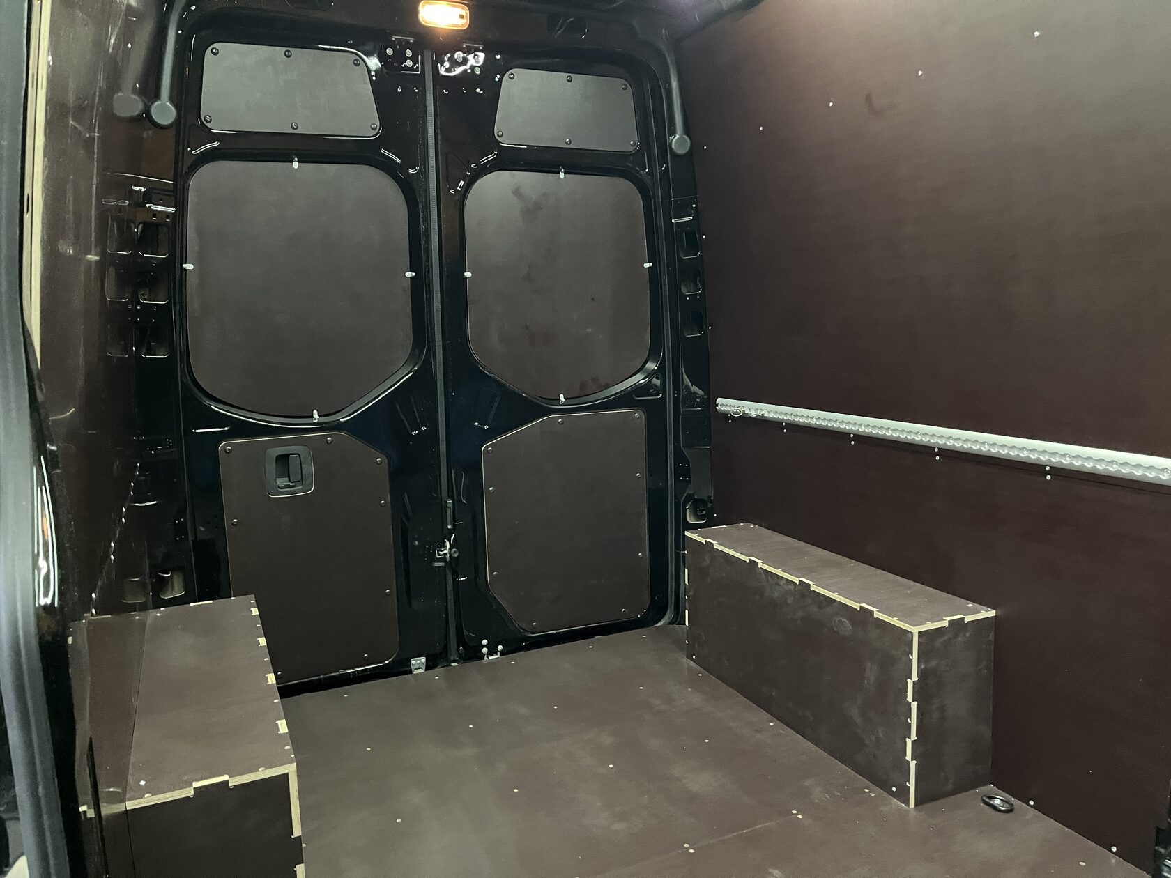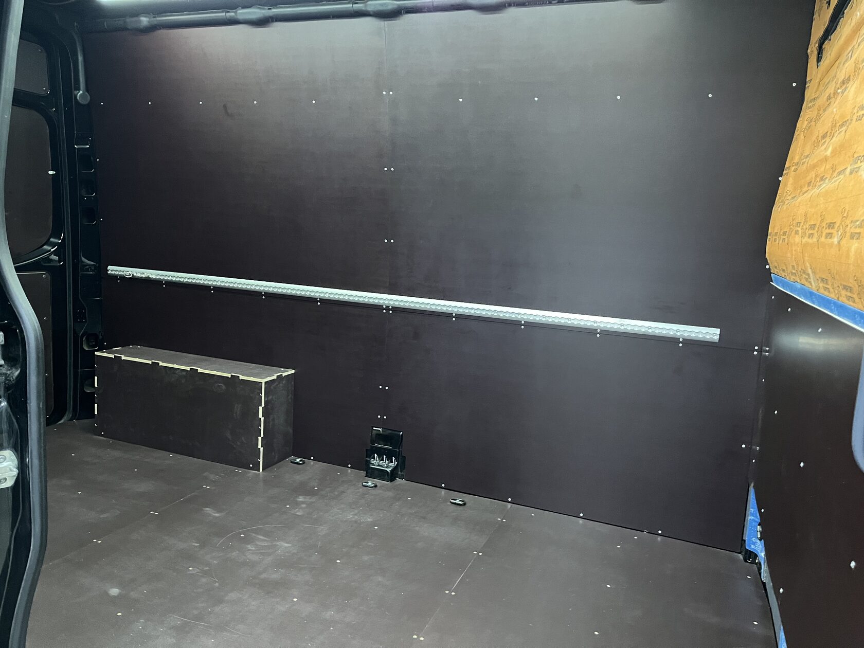 Выполнили работу по обшивке кузова Мерседес Спринтер фанерой. Полл и арки - ламинированная фанера 12мм, стены, двери, перегородка - ламинированная фанера 6мм.