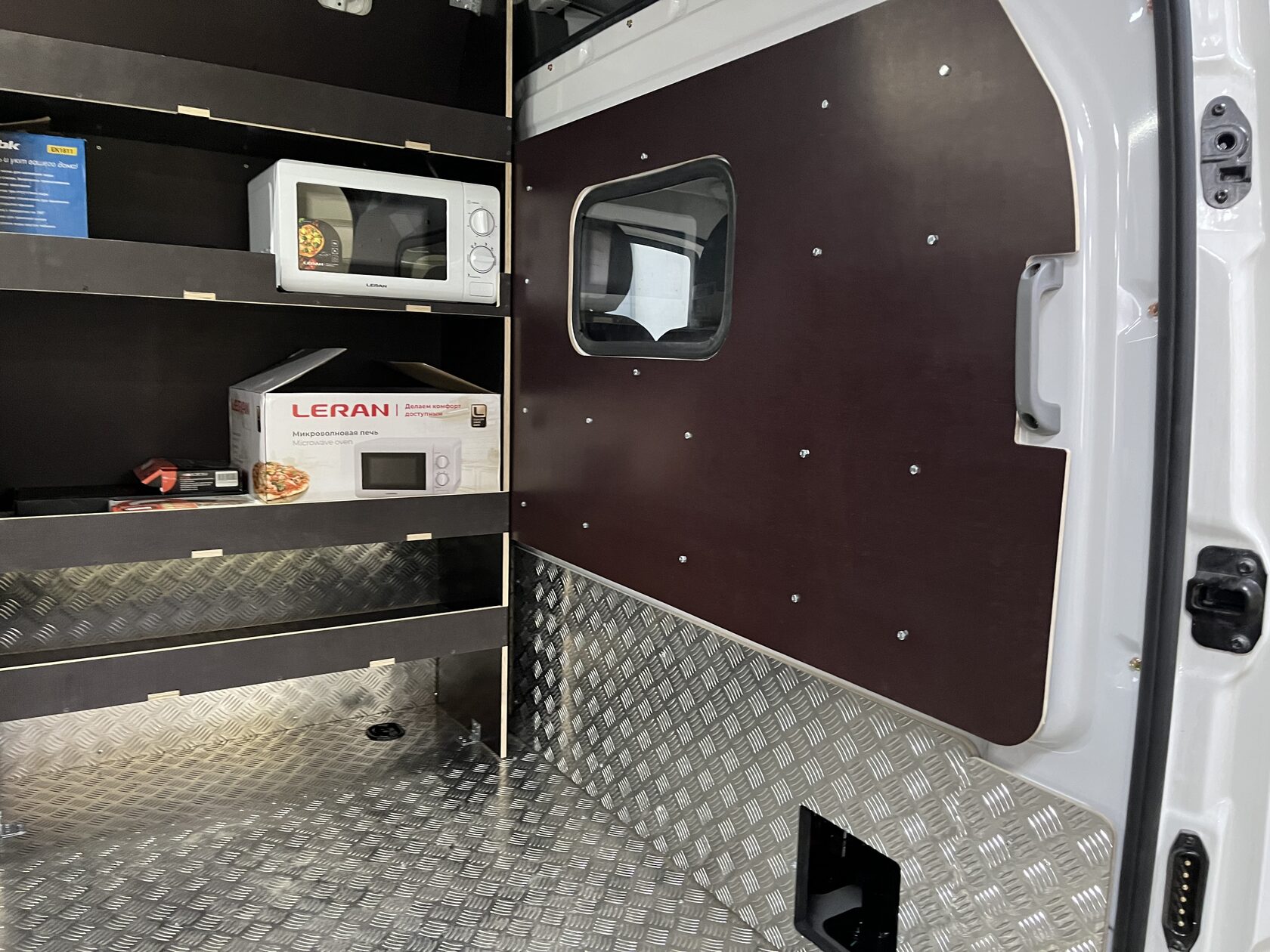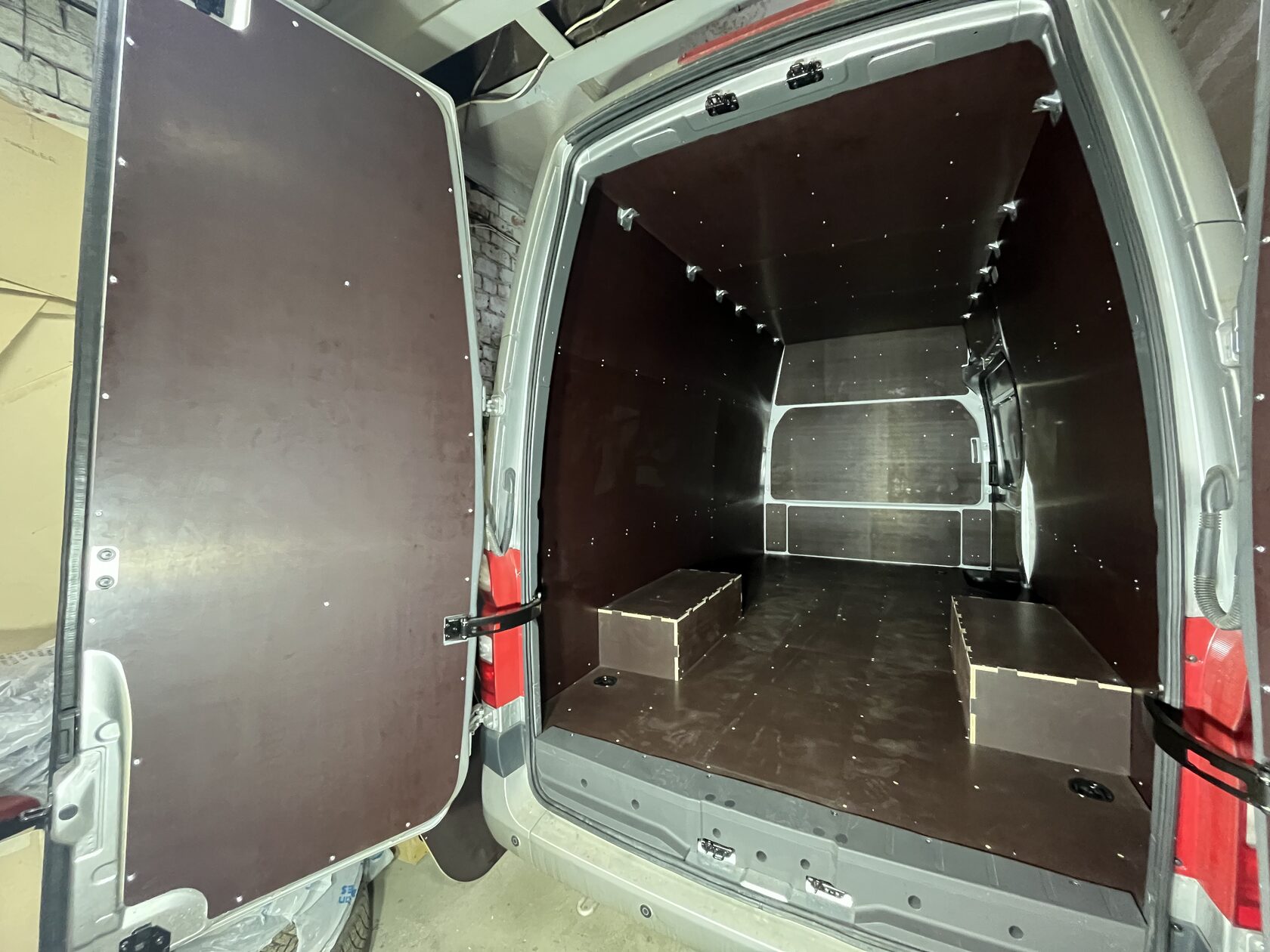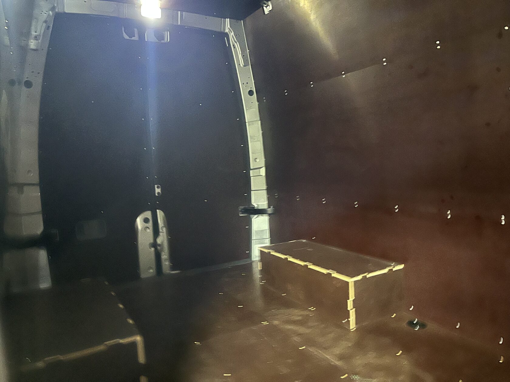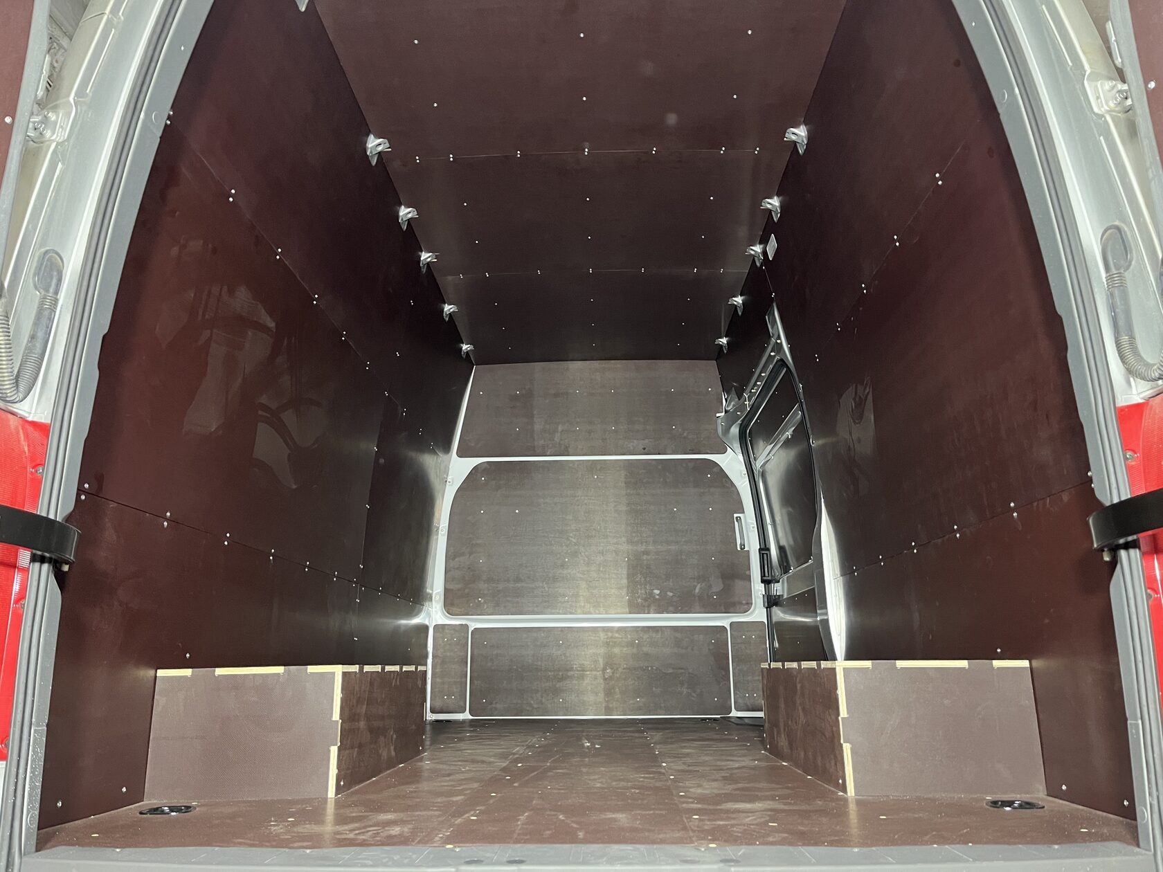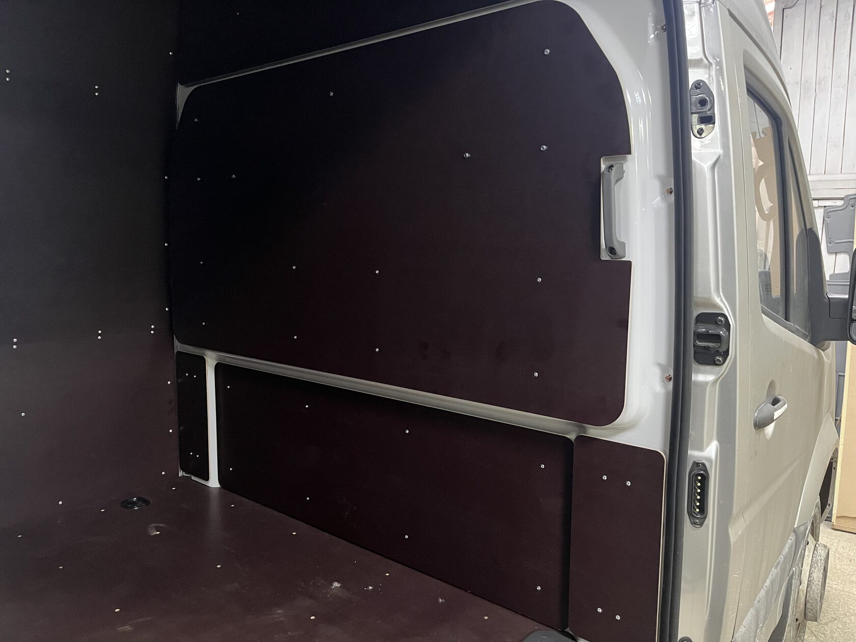 Выполнили полную обшивку кузова ламинированной фанерой. Сделали даже потолок. Материал на полу - ламинированная фанера 12мм, на стенах, дверях, перегородке, потолок - ламинированная фанера 6мм. Все закреплено на алюминиевые заклепки. Пол закреплен по технологии автодомов.