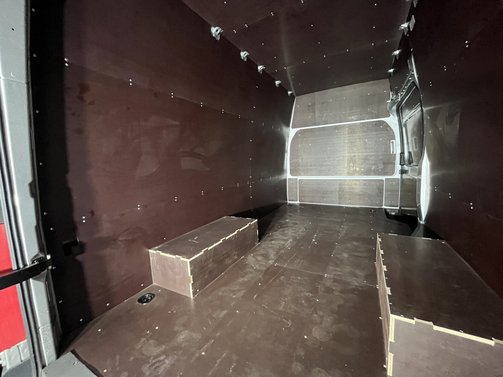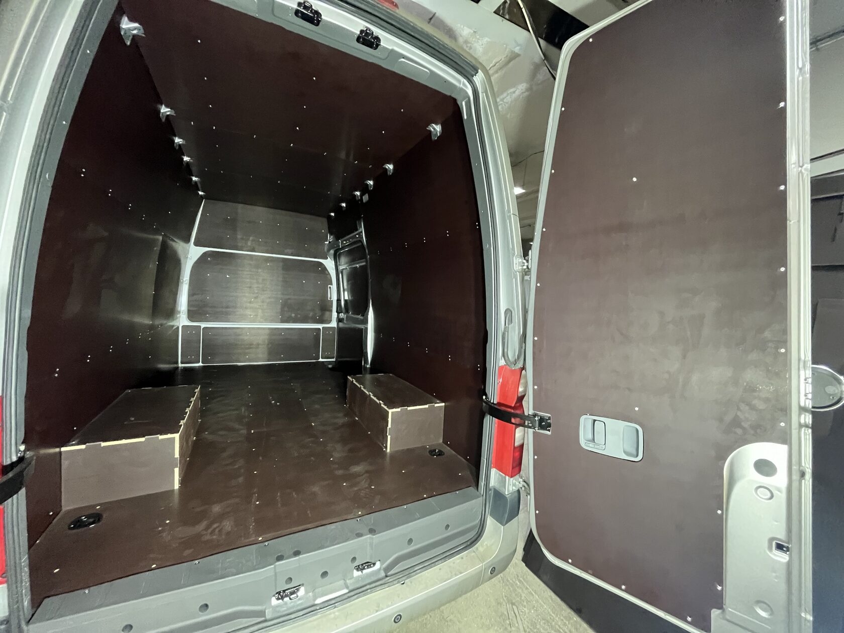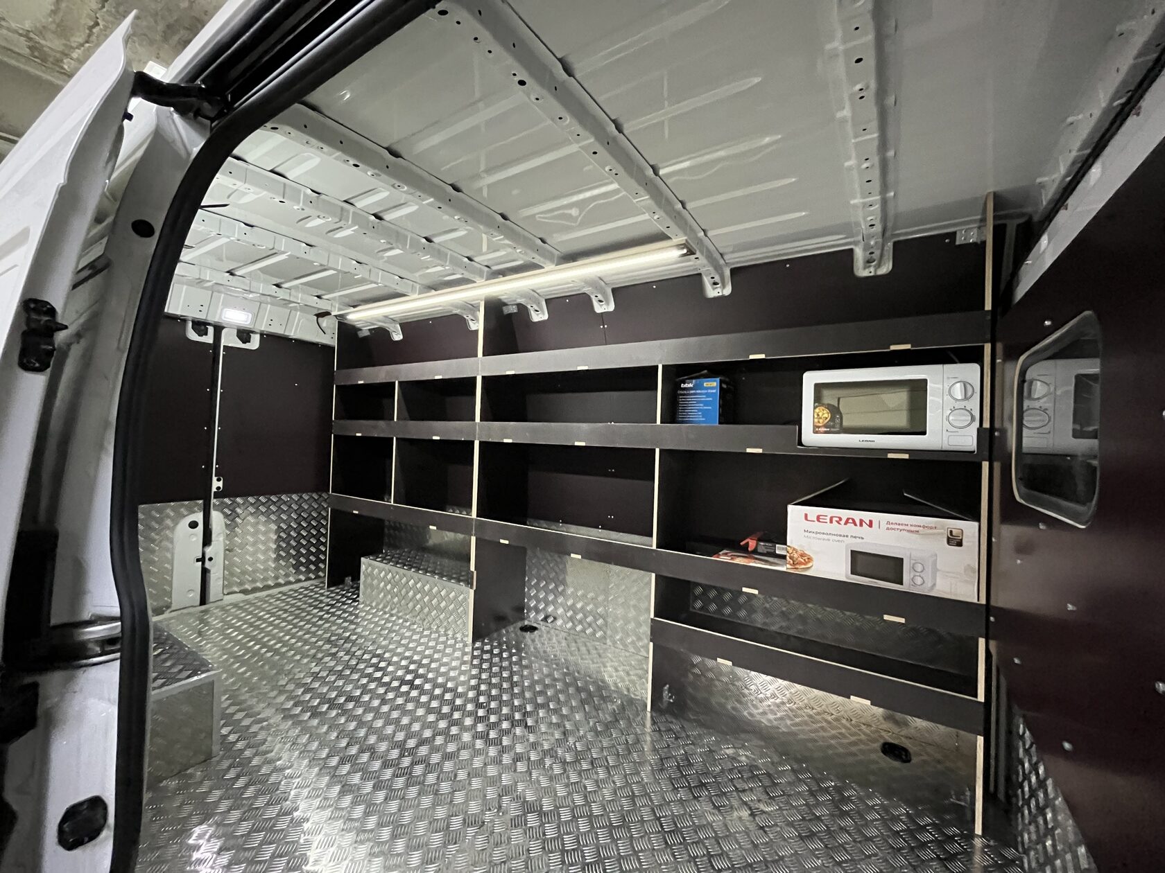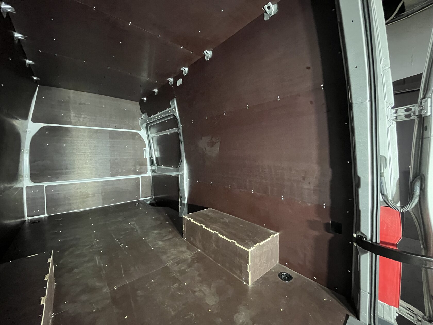 Выполнили полную обшивку кузова ламинированной фанерой. Сделали даже потолок. Материал на полу - ламинированная фанера 12мм, на стенах, дверях, перегородке, потолок - ламинированная фанера 6мм. Все закреплено на алюминиевые заклепки. Пол закреплен по технологии автодомов.
