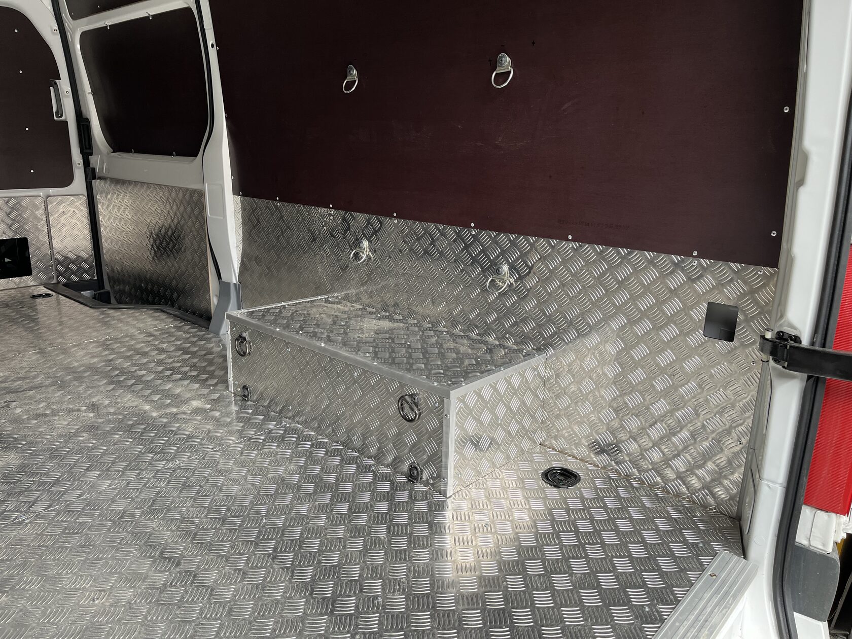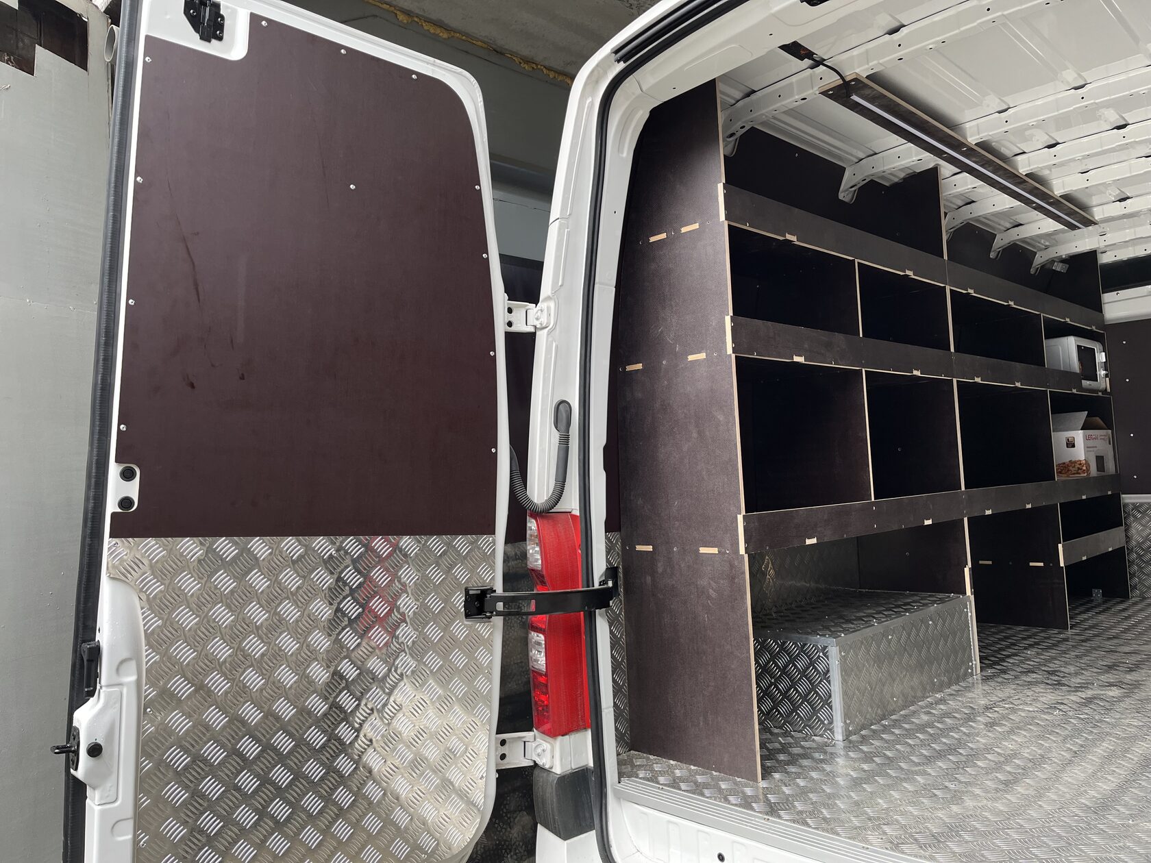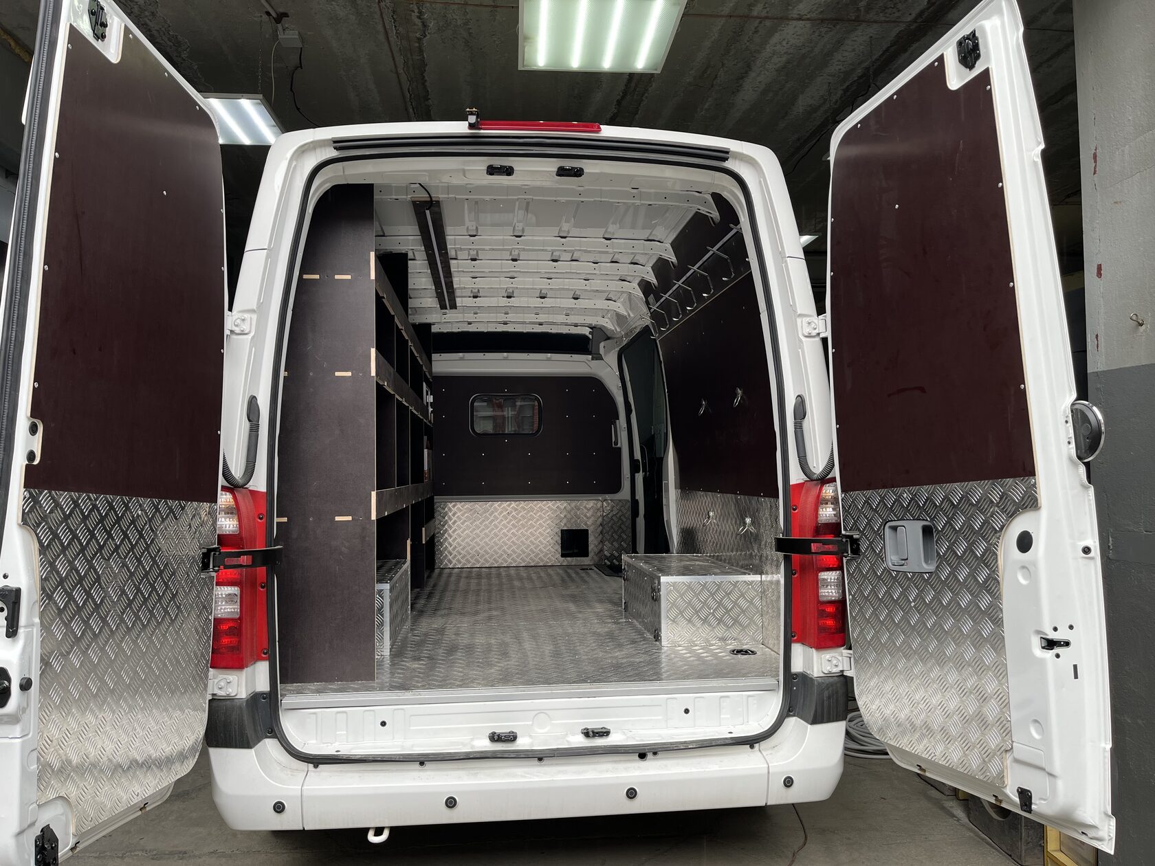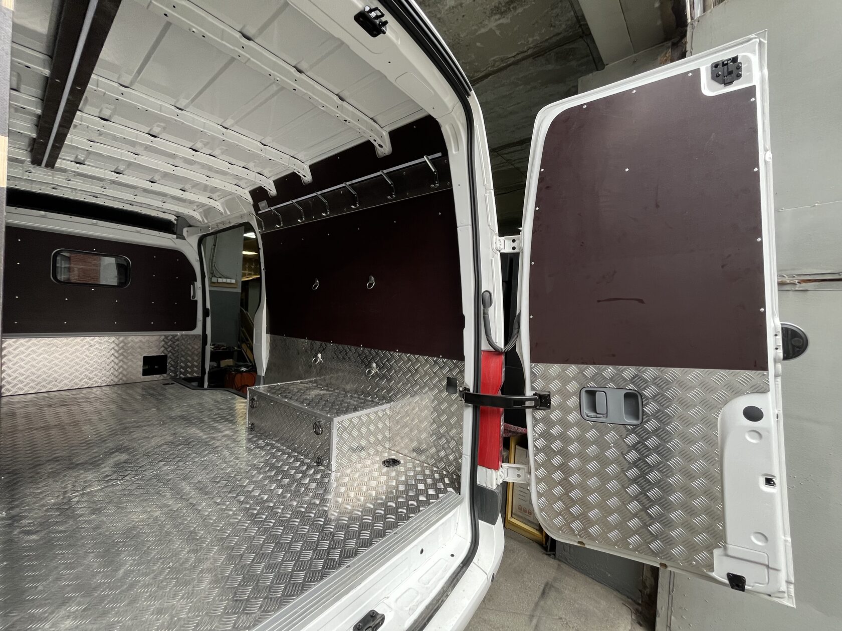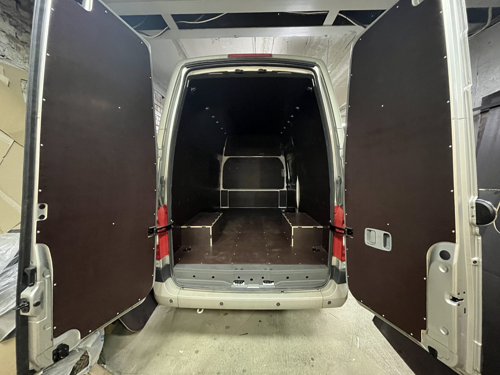 Выполнили полную обшивку кузова ламинированной фанерой. Сделали даже потолок. Материал на полу - ламинированная фанера 12мм, на стенах, дверях, перегородке, потолок - ламинированная фанера 6мм. Все закреплено на алюминиевые заклепки. Пол закреплен по технологии автодомов.