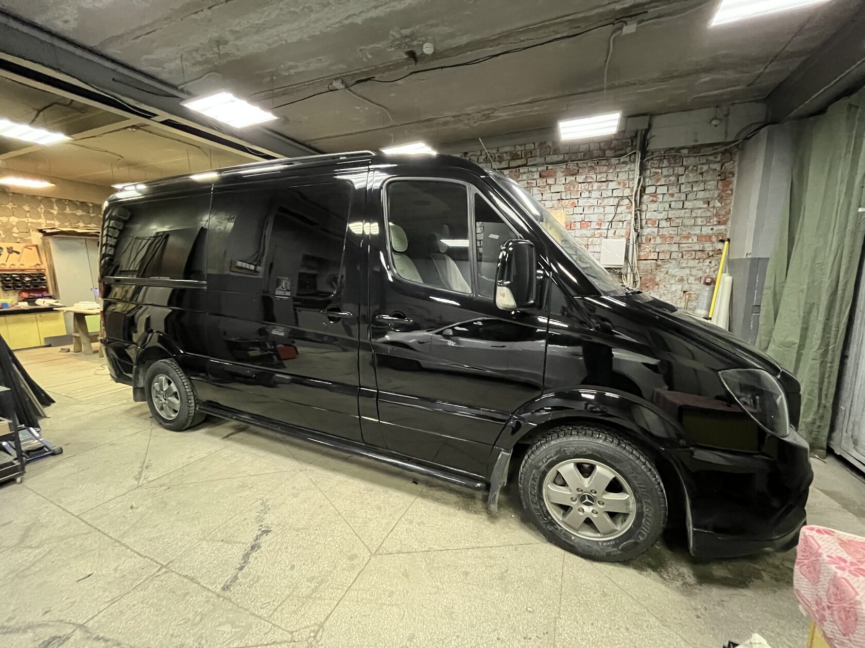 Выполнили работу по обшивке кузова Мерседес Спринтер фанерой. Полл и арки - ламинированная фанера 12мм, стены, двери, перегородка - ламинированная фанера 6мм. Так же установили по бокам алюминиевую такелажную рейку.